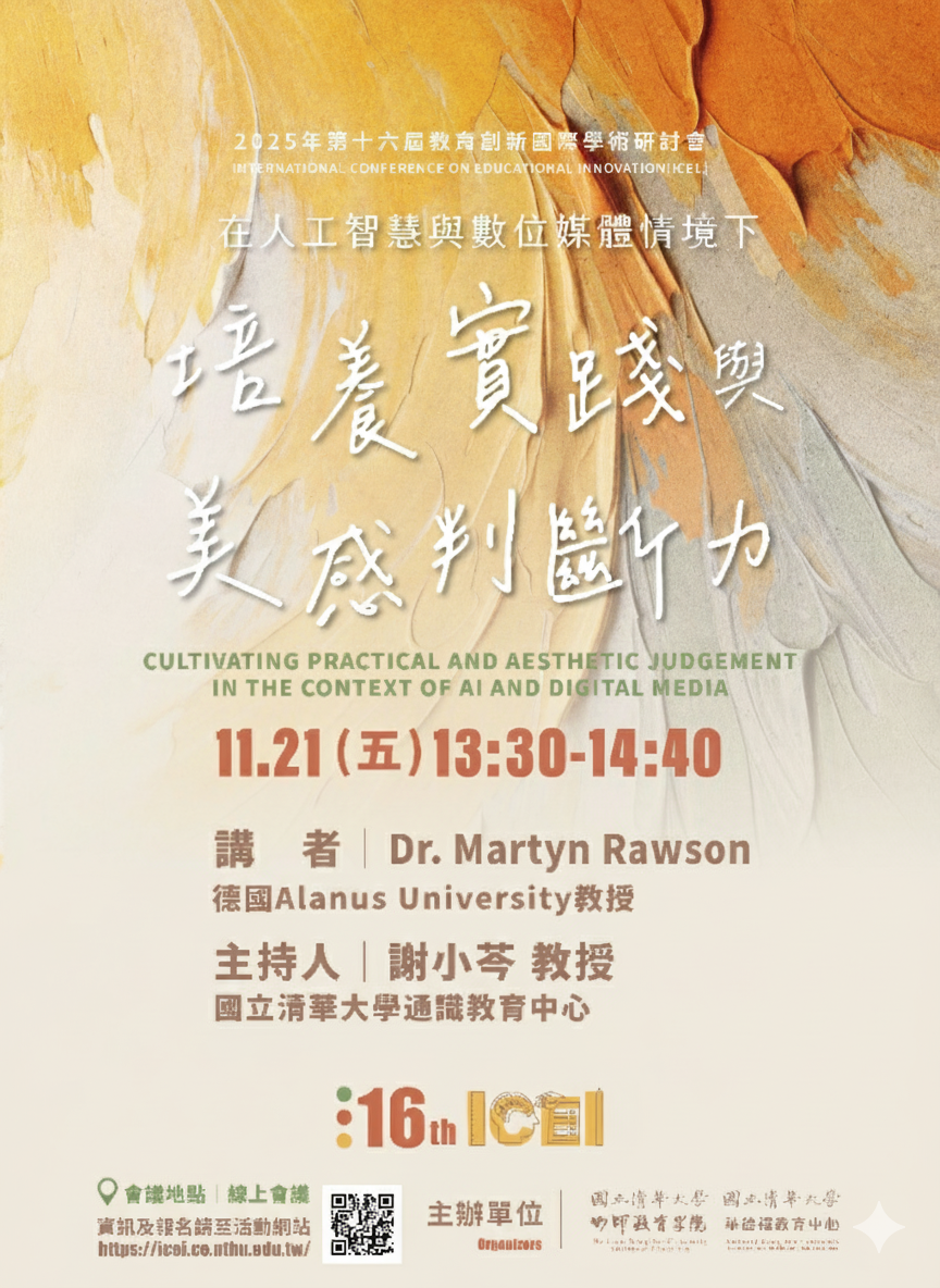 國立清華大學華德福教育中心在2025年竹師教育學院舉辦的「第十六屆教育創新國際學術研討會」特別推出一場以「在人工智慧與數位媒體情境下,培養實踐與美感判斷力」為題的專題演講,邀請德國 Alanus University 教授 Dr. Martyn Rawson (也是本校教育學院華德福碩士在職學位學程兼任教授)分享精闢的論述。